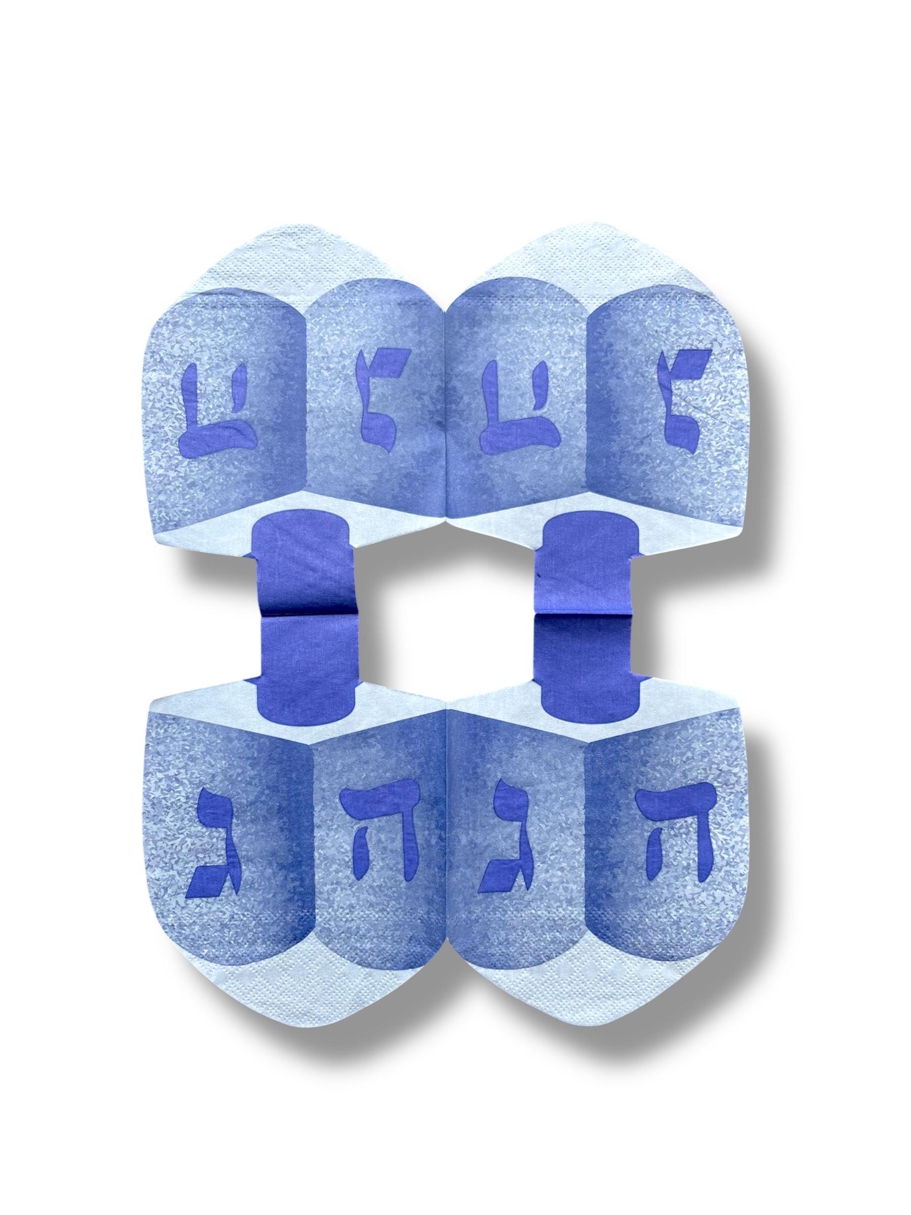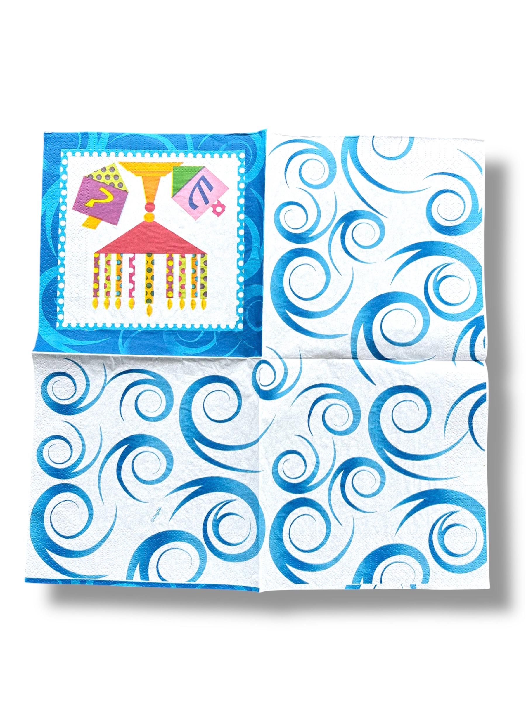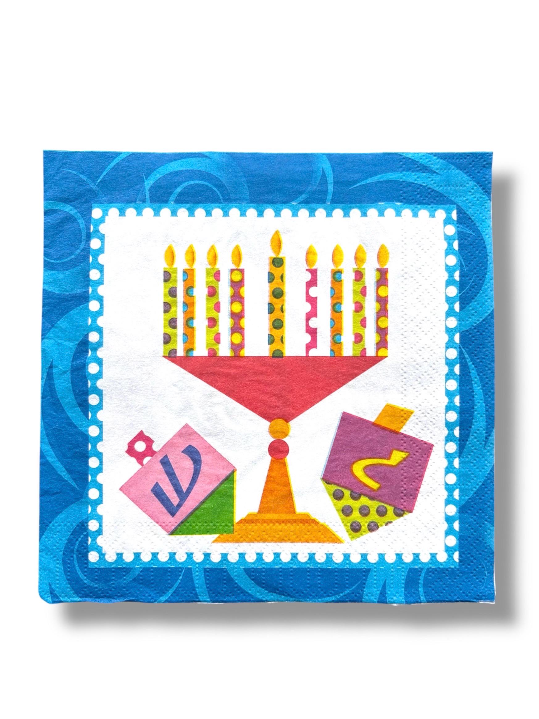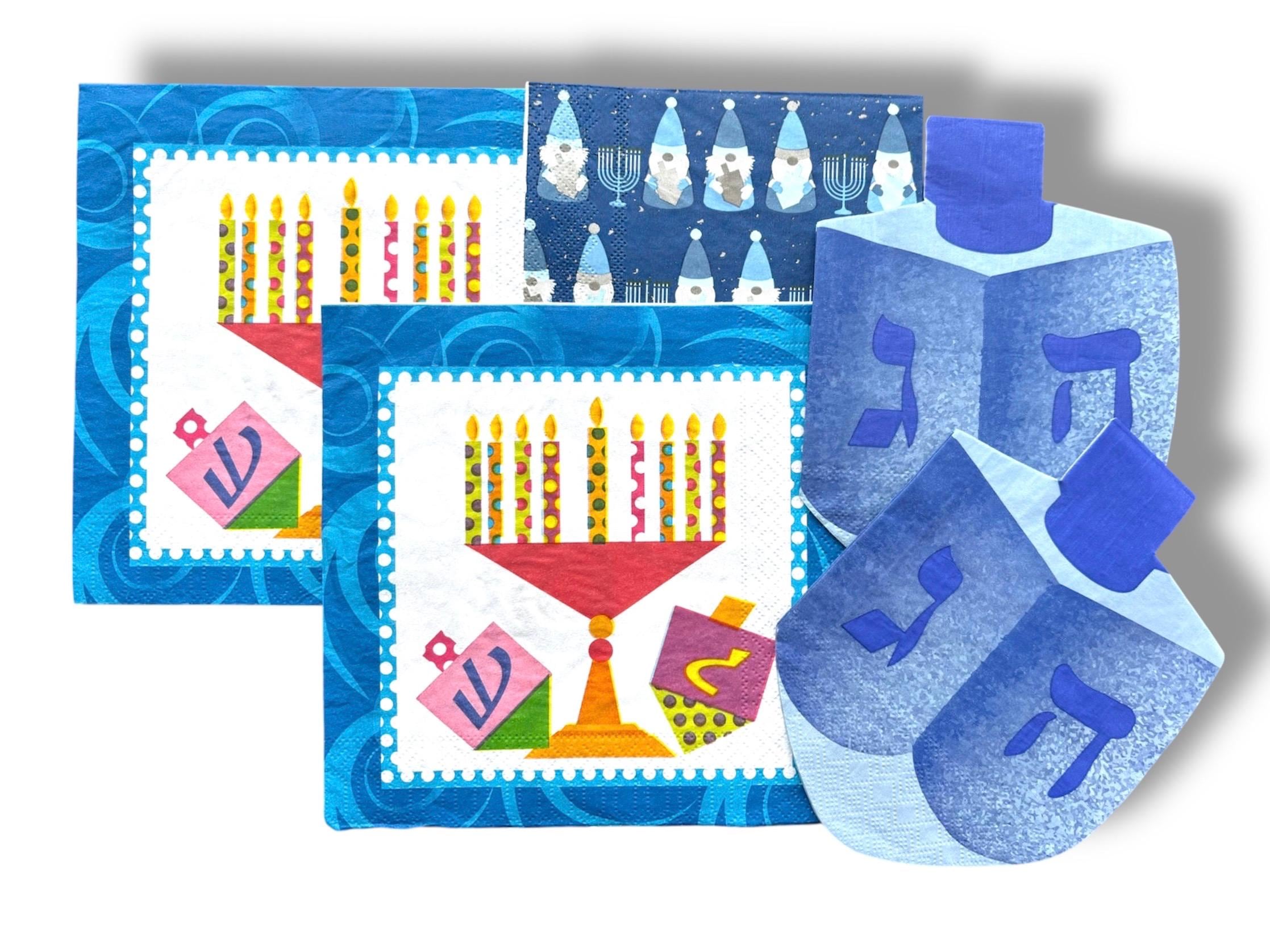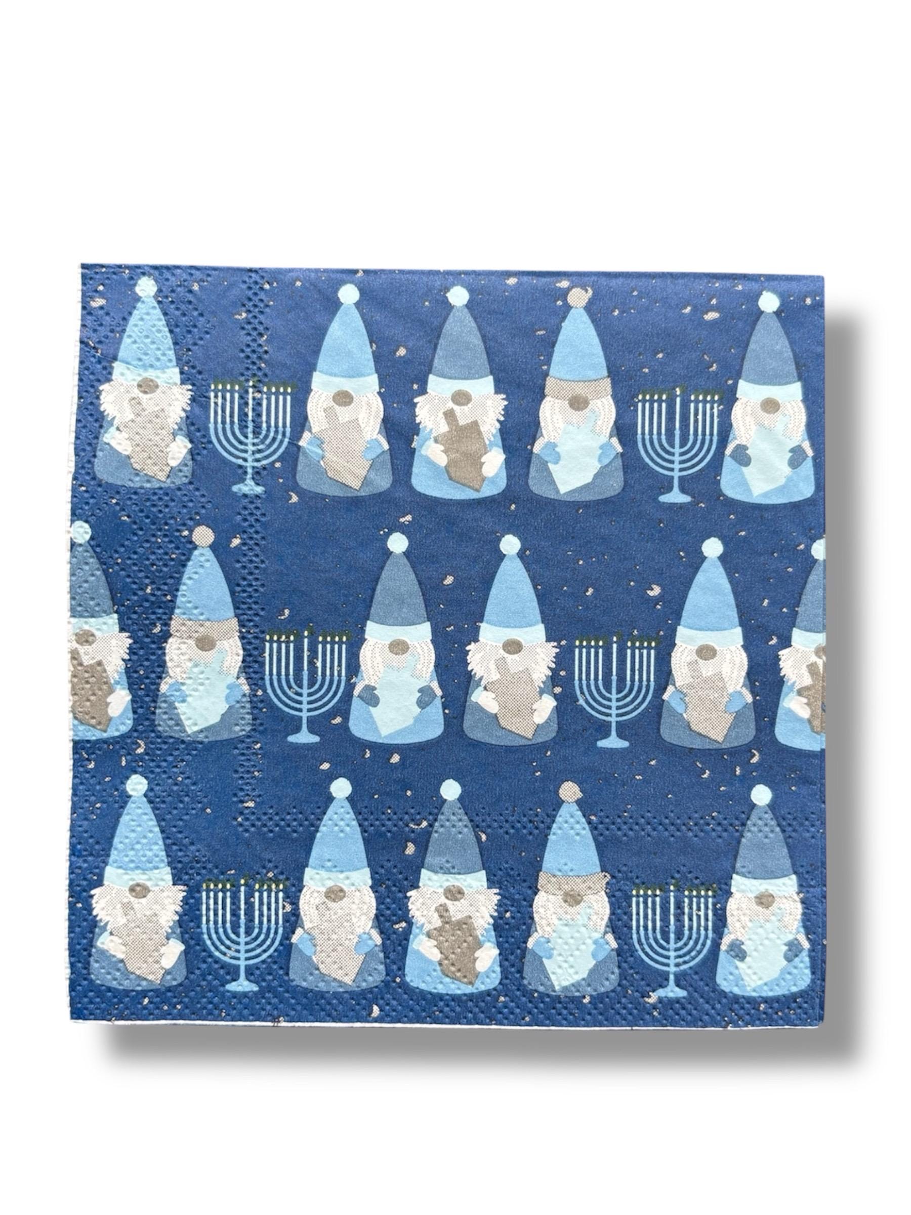 Beautiful Hanukkah items are showcased on paper napkins. Dredle, Menorah, and Cute Gnomes adorn these napkins. The napkins include the plys.